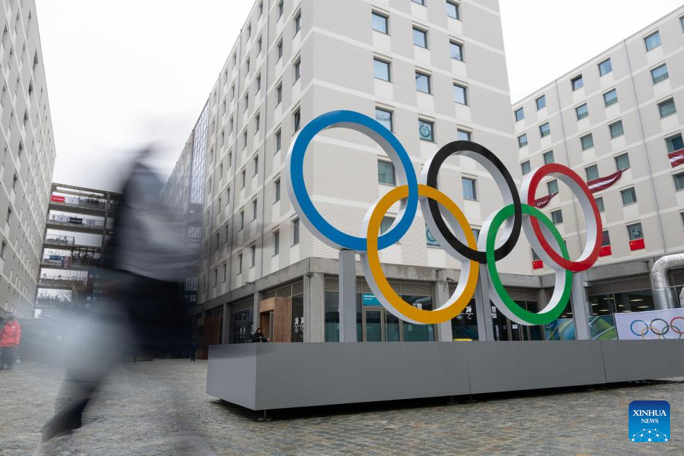The Olympic rings are seen at the Olympic Village ahead of the 2026 Milan-Cortina Winter Olympics in Milan, Italy, Feb. 3, 2026. (Xinhua/Zhang Haofu)