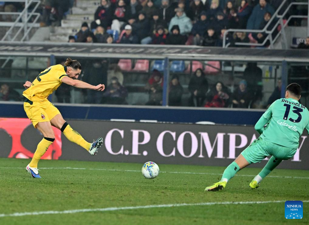 AC Milan's Adrien Rabiot (L) scores during a Serie A football match between Bologna and AC Milan in Bologna, Italy, Feb. 3, 2026. (Photo by Alberto Lingria/Xinhua)