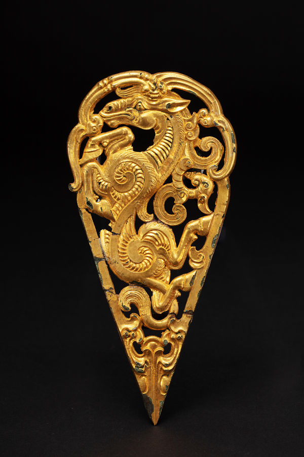 A danglu is a harness frontlet which was prevalent in ancient China. Fastened to a horse's forehead, it served as both protection and decoration; its quality and artistry directly reflected the owner's social status. This particular item, unearthed in 1999 at Luozhuang Han Tomb, one of the largest and best-preserved Han dynasty princely tombs, likely belonged to a feudal ruler or a member of the royal family.