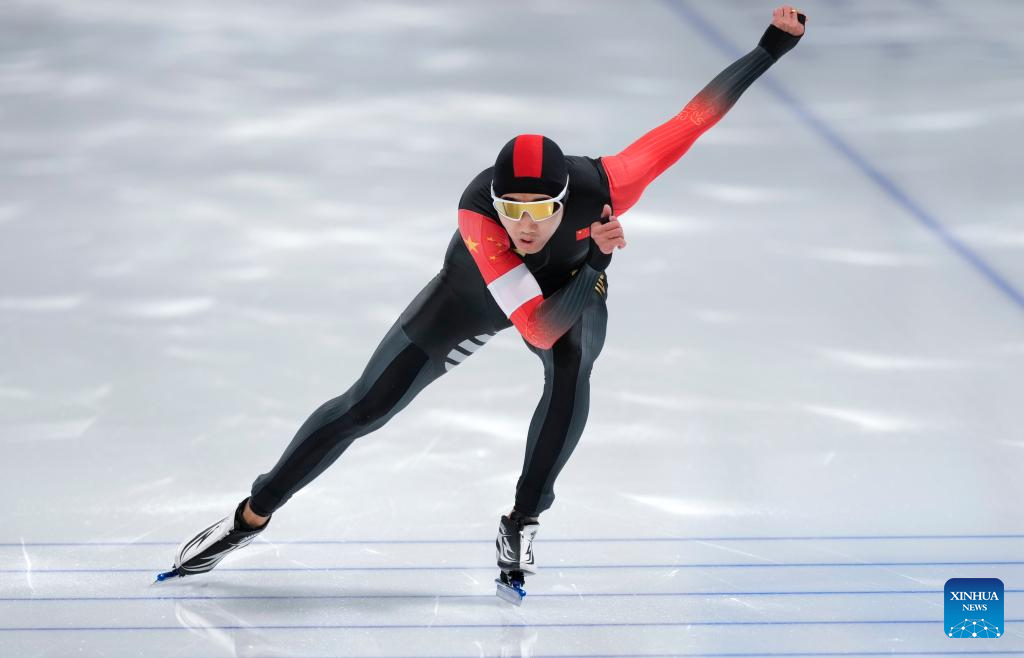 Gao Tingyu of China competes during the men's 500m final match of the speed skating event at the 9th Asian Winter Games in Harbin, northeast China's Heilongjiang Province, Feb. 10, 2025. (Xinhua/Wang Jianwei)