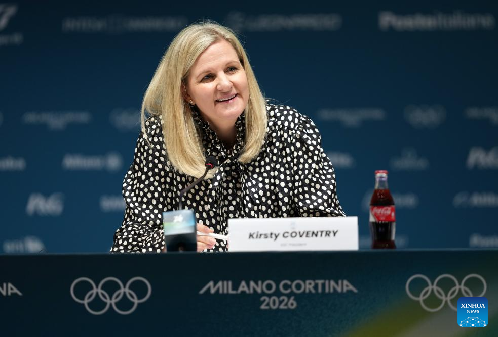 International Olympic Committee (IOC) President Kirsty Coventry reacts during a press conference of the International Olympic Committee (IOC) 145th Session in Milan, Italy, Feb. 4, 2026. (Xinhua/Na Yuqi)