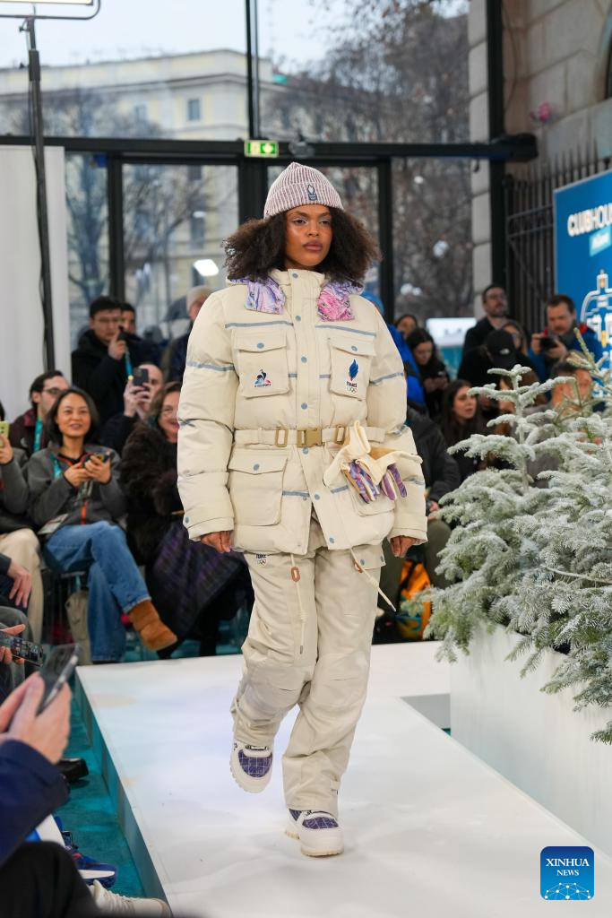 A model presents an outfit of French National Olympic Committee during a fashion show in Milan, Italy, on Feb. 4, 2026. The International Olympic Committee (IOC) hosted an Olympic Winter Games Fashion Showcase in Milan on Wednesday. The event featured a snapshot from National Olympic Committees (NOCs), including performance wear and opening ceremony outfits, with Olympians taking to the runway. (Xue Yuge/Pool via Xinhua)