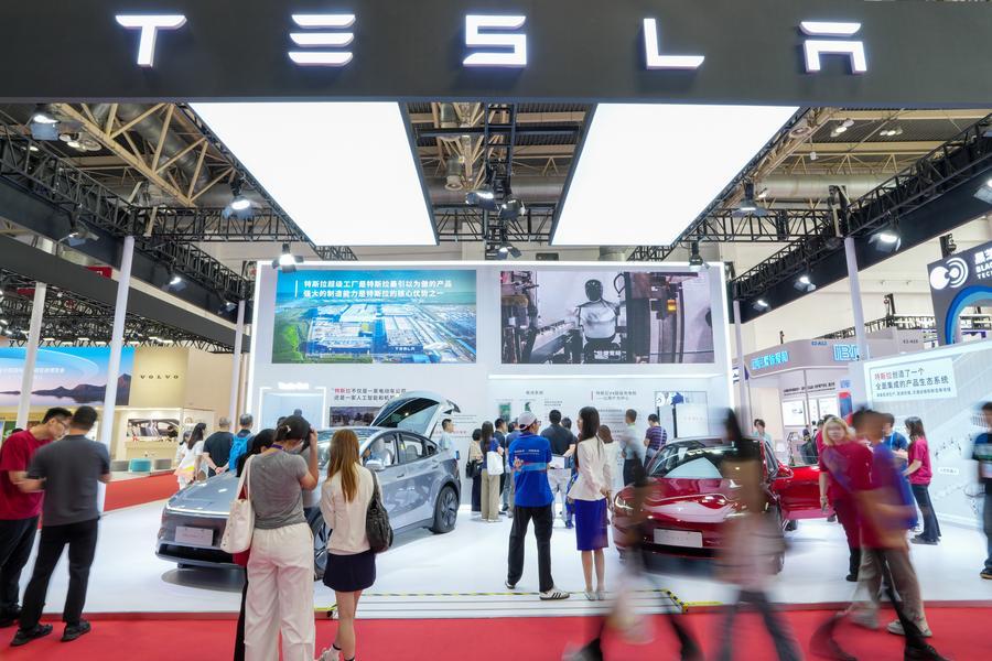 People visit the booth of TESLA at the Smart Vehicle Chain area of the third China International Supply Chain Expo (CISCE) in Beijing, capital of China, July 19, 2025. [Photo/Xinhua]