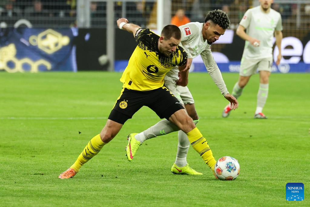 Waldemar Anton (front) of Borussia Dortmund vies with Justin Njinmah of SV Werder Bremen during the German first division Bundesliga football match between Borussia Dortmund and SV Werder Bremen in Dortmund, Germany, Jan. 13, 2026. (Photo by Joachim Bywaletz/Xinhua)