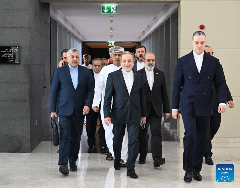 Iranian Foreign Minister Seyed Abbas Araghchi (C, front) and his accompanying delegation depart for the site of the bilateral talks in Muscat, Oman, Feb. 6, 2026. The indirect talks between Iran and the United States in Oman's Muscat were "a good start," with both sides agreeing to continue negotiations in the future, Iran's Fars News Agency reported Friday, citing Iranian Foreign Minister Seyed Abbas Araghchi. (Xinhua)