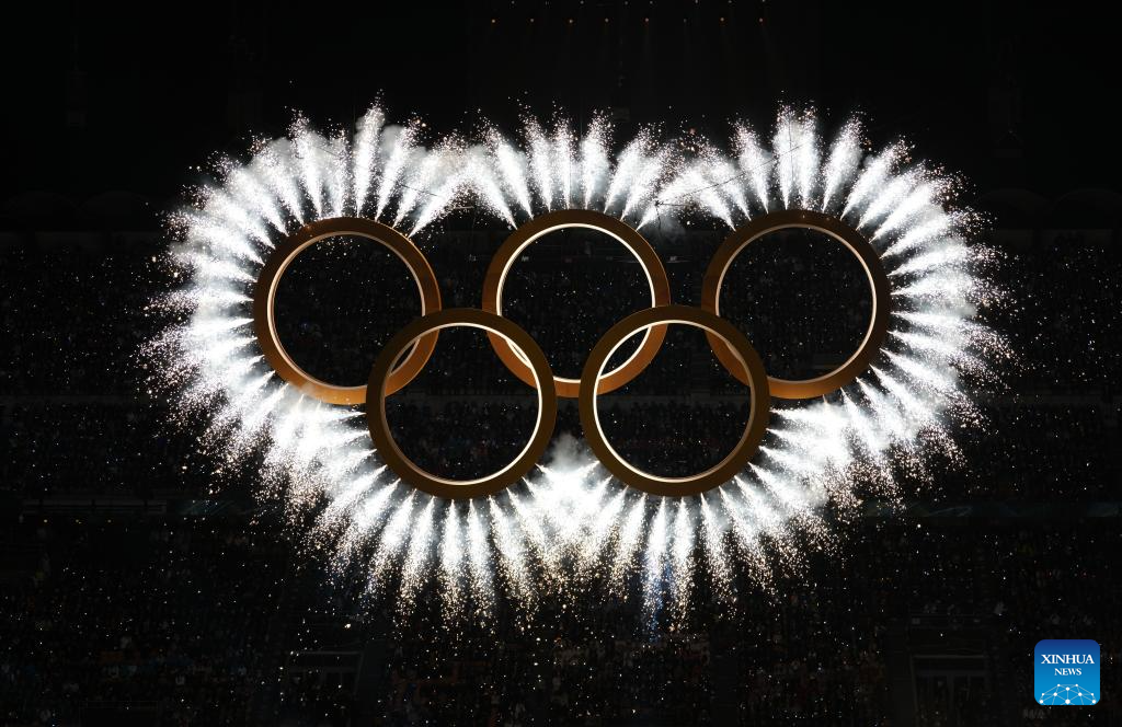 This photo taken on Feb. 6, 2026 shows the Olympic rings at the opening ceremony of the Milan-Cortina 2026 Olympic Winter Games at the San Siro Olympic Stadium in Milan, Italy. (Xinhua/Xue Yuge)
