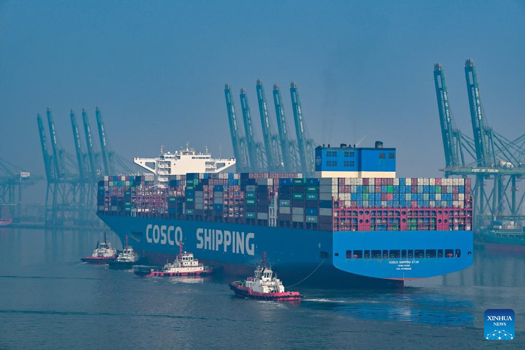 A cargo ship prepares to berth at the container dock of Tianjin Port in Tianjin, north China, Feb. 4, 2026. [Photo by Zhao Zishuo/Xinhua]