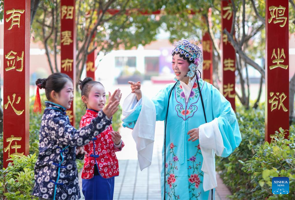 Children learn performance of traditional Chinese opera under the guidance of an instructor in Taizhou, east China's Jiangsu province, on Feb. 8, 2026. Various extracurricular activities are available for students across China during the winter vacation. (Photo by Zhou Shegen/Xinhua)