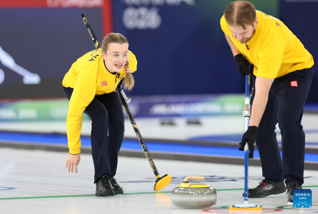 Rasmus Wranaa (R) and Isabella Wranaa of Sweden competes during the curling mixed doubles semi-final between Britain and Sweden at the Milan-Cortina 2026 Olympic Winter Games in Cortina, Italy, Feb. 9, 2026. (Xinhua/Ding Xu)