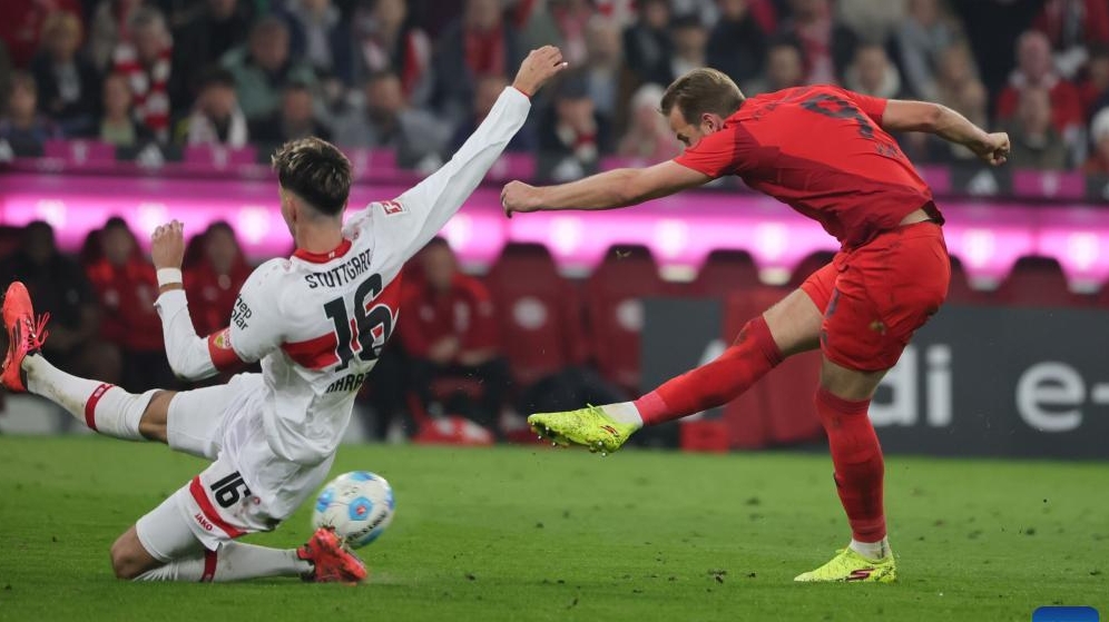 Harry Kane (R) of Bayern Munich shoots during the German first division Bundesliga football match between Bayern Munich and VfB Stuttgart in Munich, Germany, Oct. 19, 2024. (Photo by Philippe Ruiz/Xinhua)