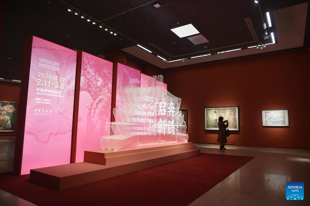 A visitor takes a photo of a painting at the National Art Museum of China in Beijing, capital of China, Feb. 9, 2026. The opening ceremony of the Spring Festival Exhibition Series of National Art Museum of China (NAMOC) was held here on Monday. The series includes five exhibitions, covering various art forms such as Chinese painting, oil painting, printmaking, sculpture, etc. (Xinhua/Lu Peng)