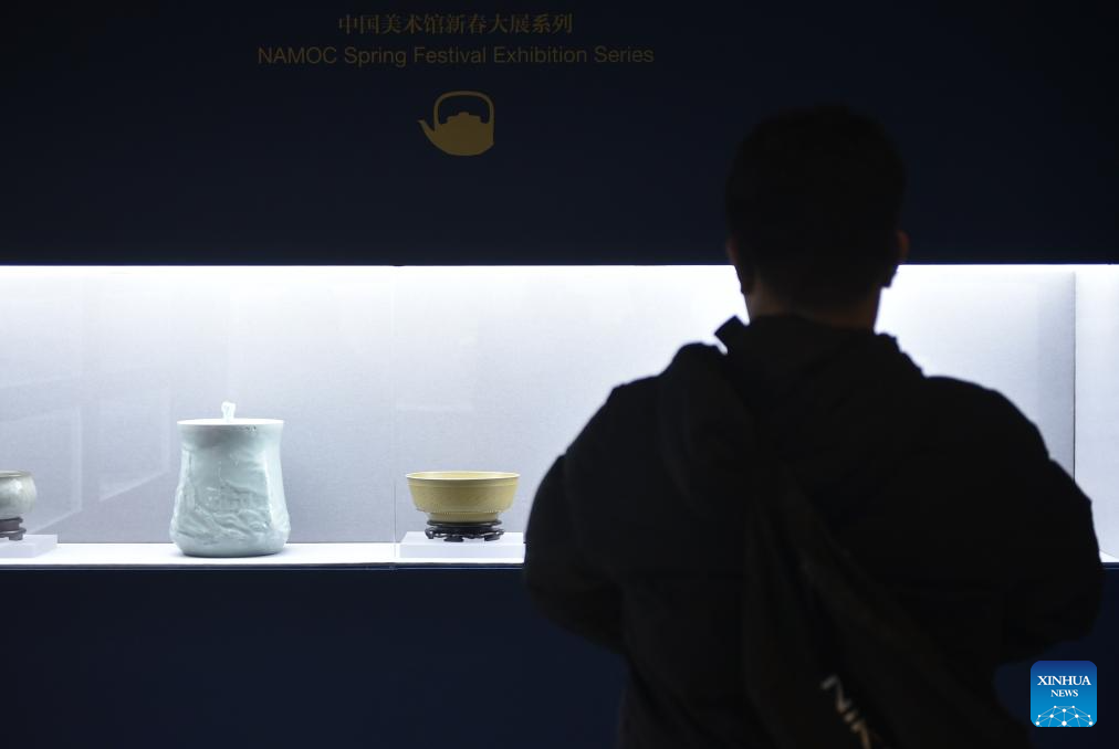 A visitor views exhibits at the National Art Museum of China in Beijing, capital of China, Feb. 9, 2026. The opening ceremony of the Spring Festival Exhibition Series of National Art Museum of China (NAMOC) was held here on Monday. The series includes five exhibitions, covering various art forms such as Chinese painting, oil painting, printmaking, sculpture, etc. (Xinhua/Lu Peng)