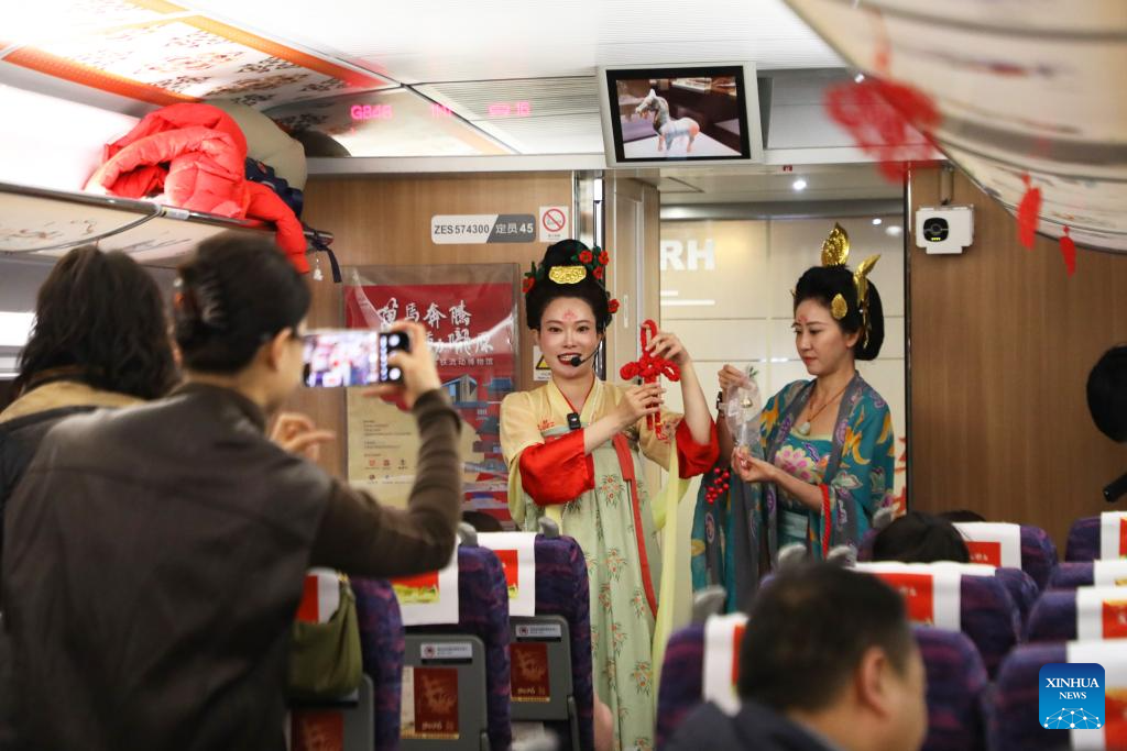 Museum staff members introduce cultural knowledge to passengers aboard the train G848 in northwest China's Gansu Province, Feb. 9, 2026. (Xinhua/Zhang Zhimin)
