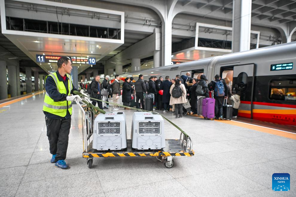 A staff member prepares to place pet transport cases on a bullet train at Chongqing West Railway Station in southwest China's Chongqing Municipality, Feb. 9, 2026. (Xinhua/Tang Yi)