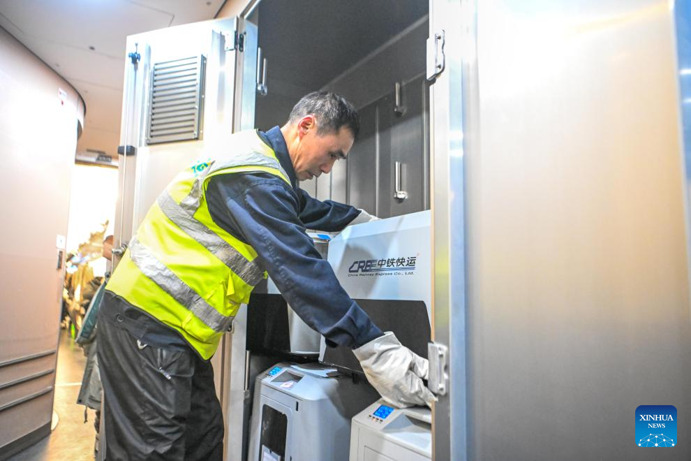 A staff member places a pet transport case on a bullet train at Chongqing West Railway Station in southwest China's Chongqing Municipality, Feb. 9, 2026. (Xinhua/Tang Yi)