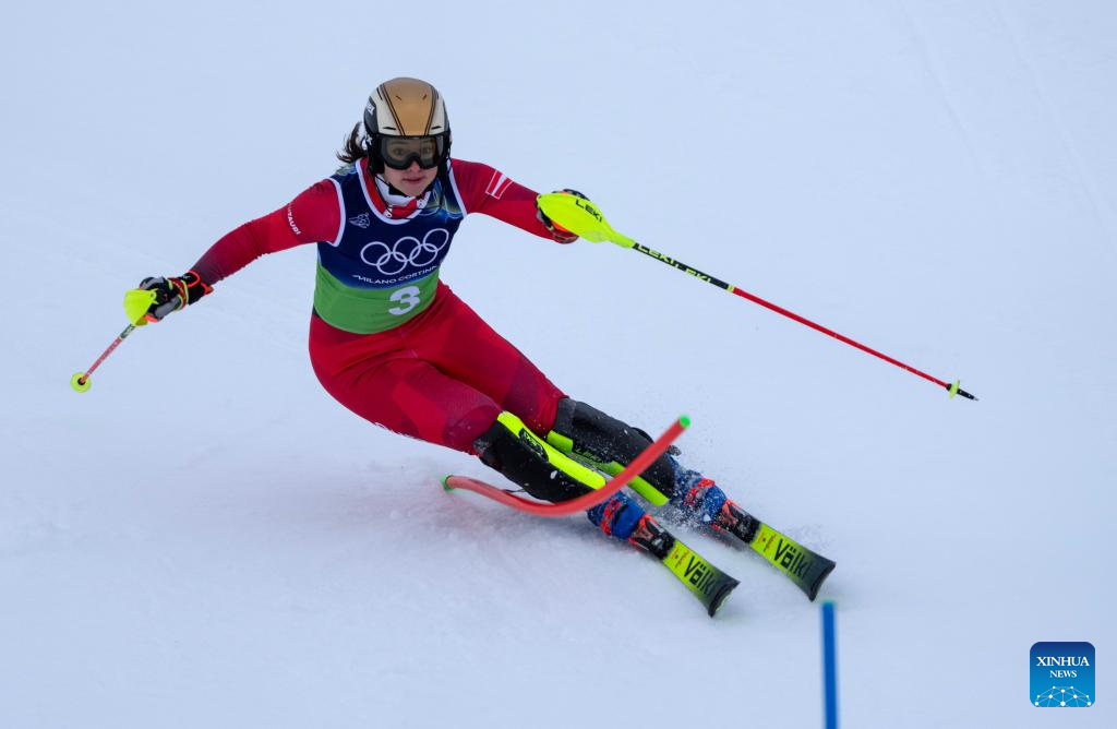 Katharina Huber of Austria competes during the slalom of the alpine skiing women's team combined at the Milan-Cortina 2026 Olympic Winter Games in Cortina, Italy, Feb. 10, 2026. (Xinhua/Fei Maohua)