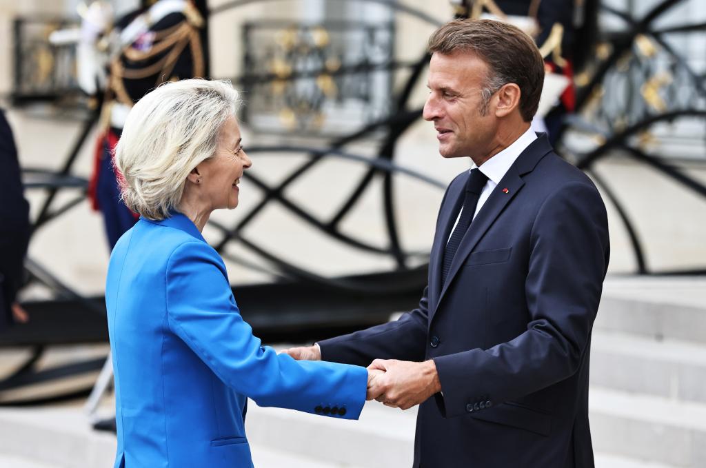 French President Emmanuel Macron (R) greets European Commission President Ursula von der Leyen upon her arrival to attend the meeting of the "Coalition of the Willing" at the Elysee Palace in Paris, France, Sept. 4, 2025. [Photo/Xinhua]