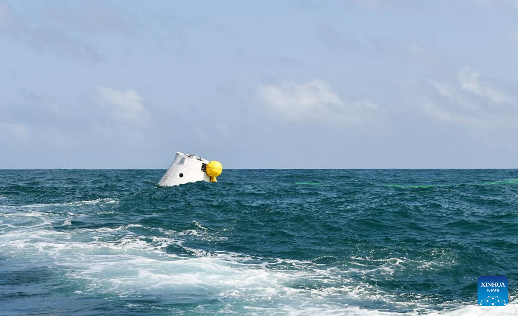 This photo taken on Feb. 11, 2026 shows the return capsule of China's new-generation Mengzhou crewed spaceship in waters near Wenchang, south China's Hainan Province. A low-altitude demonstration and verification flight test for the Long March-10 carrier rocket and a maximum dynamic pressure abort flight test for the new-generation crewed spaceship system Mengzhou are successfully conducted at the Wenchang Spacecraft Launch Site in south China's Hainan province on Wednesday. [Photo/Xinhua]