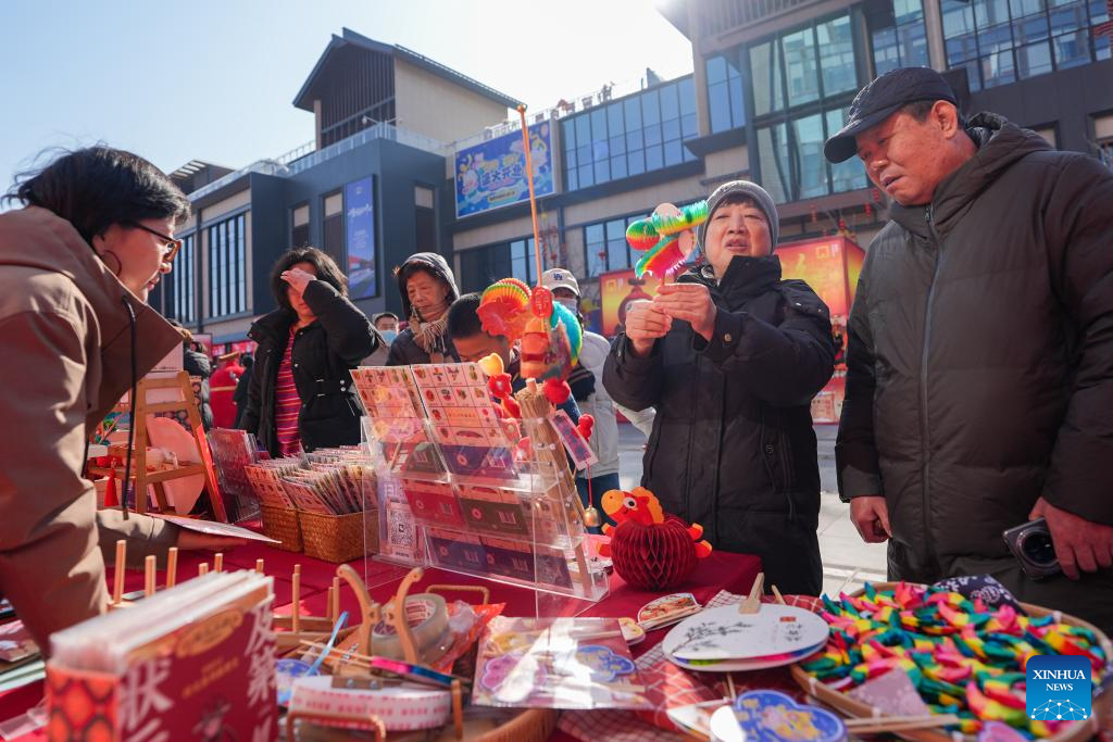 People select Fanlihua, a paper-made traditional flipping toy, at a stall during a festive fair held at the Longfusi commercial area in Dongcheng District of Beijing, capital of China, Feb. 12, 2026. The fair held in celebration of the upcoming Spring Festival creates diverse consumption scenarios for citizens and tourists. It will last until March 3. (Xinhua/Ju Huanzong)