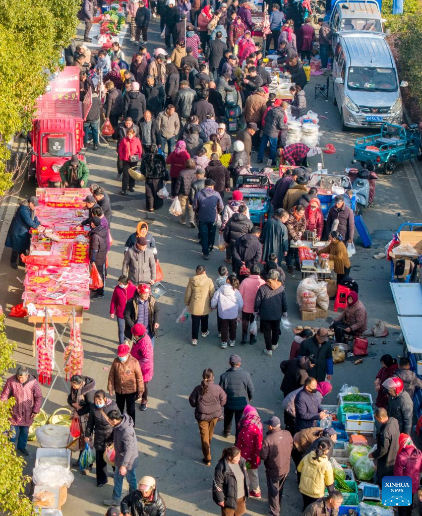 This aerial drone photo shows people purchasing goods needed for the Chinese New Year celebrations at a market in Yinji Township of Huai'an City, east China's Jiangsu Province, Feb. 13, 2026. (Photo by Yang Yugang/Xinhua)