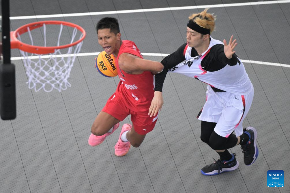 Igo Kenya (R) of Japan guards against Nur Aufa Bin Emil Putra of Singapore during the FIBA 3x3 Basketball Asia Cup men's quarterfinal match between Japan and Singapore in Singapore, March 30, 2025. (Photo by Then Chih Wey/Xinhua)