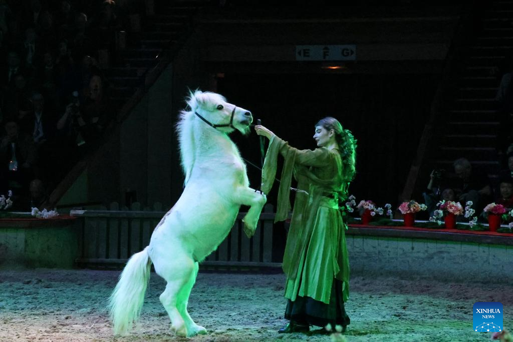 A traditional French equestrian performance is staged during a gala celebrating the Chinese Year of the Horse at the Great Stables in the estate of the Chateau de Chantilly in the Hauts-de-France region, France, Feb. 11, 2026. Co-hosted by the Hauts-de-France regional authorities and the Chinese Embassy in France, the event was distinct from many other Chinese New Year activities. At the Great Stables, the highlight was a distinctly local art form: traditional French equestrian performance. (Xinhua/Zhang Baihui)