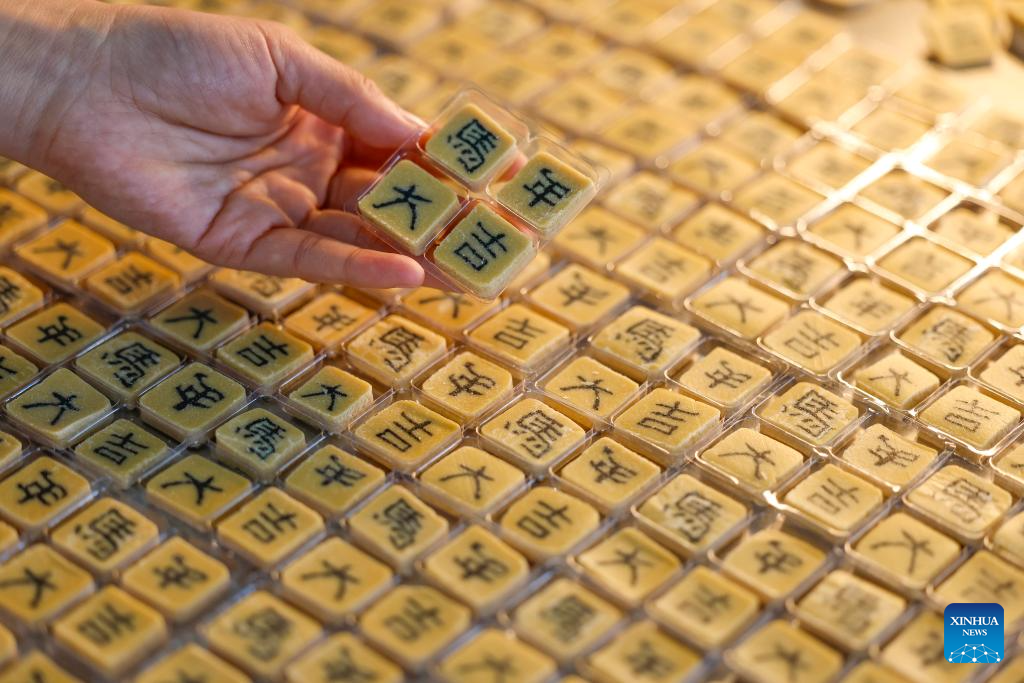 A staff member displays character-inlaid candy cubes in Qimen County of Huangshan City, east China's Anhui Province, Jan. 13, 2026.
