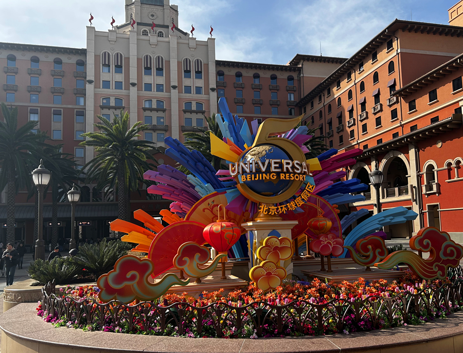 A floral installation for the park's fifth anniversary at the entrance of Universal Beijing Resort, Feb. 10, 2026. [Photo/China.org.cn]