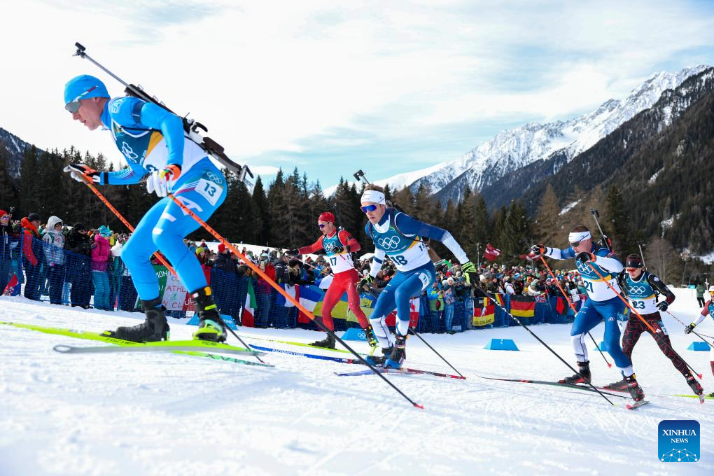 Athletes compete during the biathlon Men's 12.5km Pursuit at the 2026 Milan-Cortina Winter Olympics in Anterselva, Italy, Feb. 15, 2026. (Xinhua/Zhang Tao)