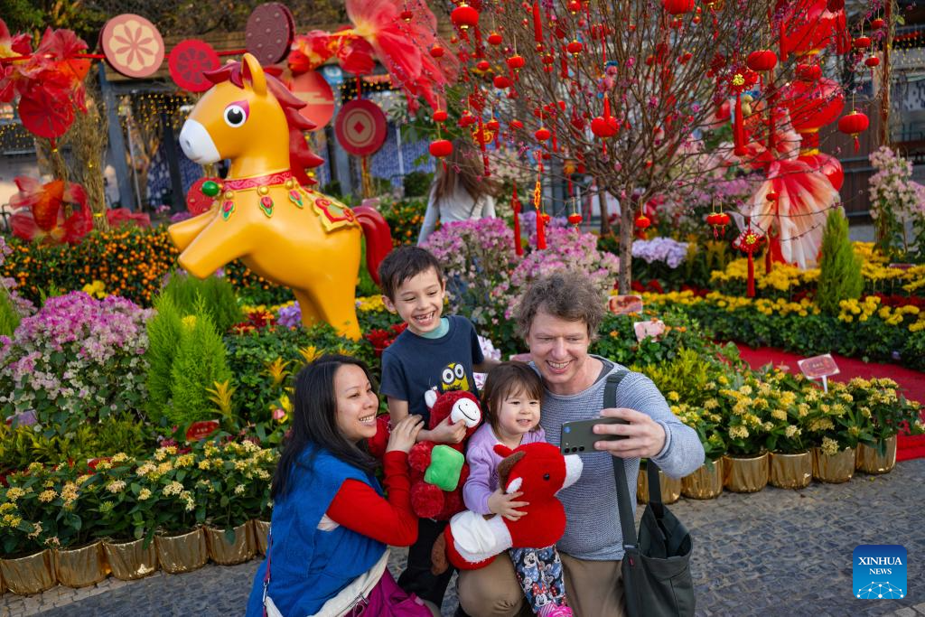 People pose for selfies at a Spring Festival market in Macao, south China, Feb. 15, 2026. [Photo/Xinhua]