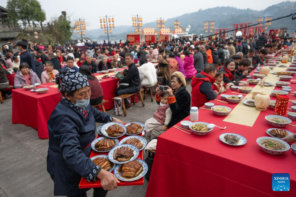 People enjoy a grand feast to mark the Chinese New Year's Eve in Songgai ancient town in southwest China's Chongqing, Feb. 16, 2026.