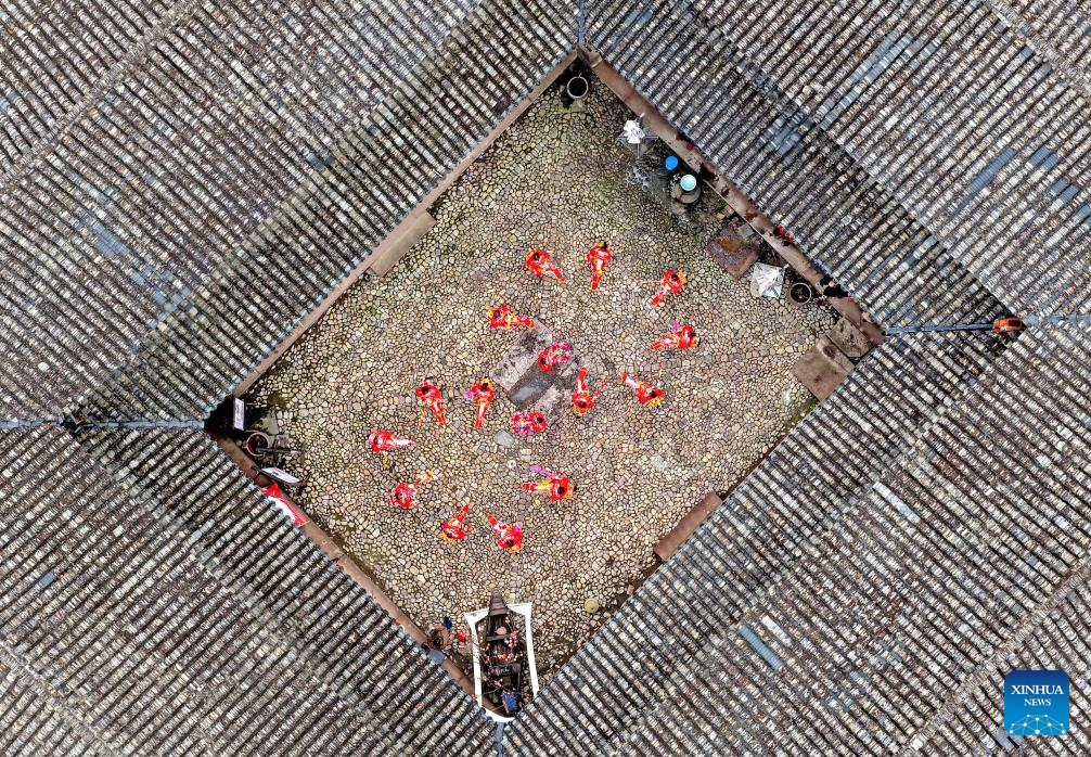 An aerial drone photo taken on Feb. 17, 2026 shows artists performing folk dance in Xianju County, in Taizhou, east China's Zhejiang Province. This year's Spring Festival saw a surge of visitors eager to experience local cuisine, rich history and vibrant folk performances. (Photo by Wang Huabin/Xinhua)