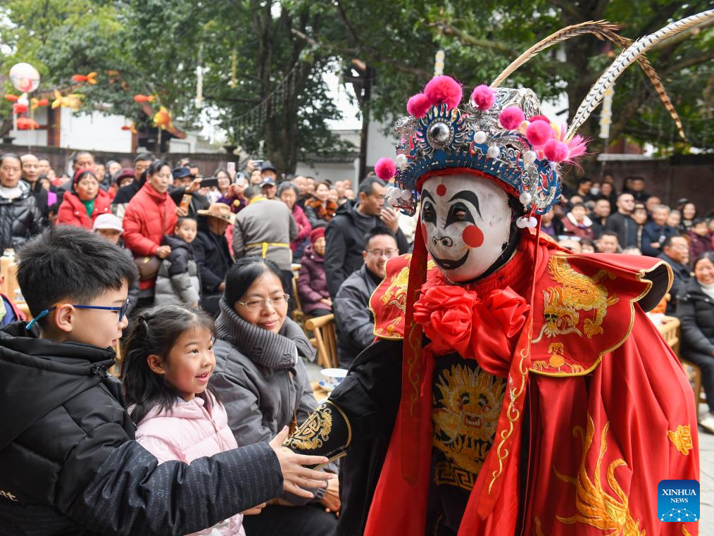 A face-changing performer interacts with the audience in Langzhong ancient town of Langzhong City, southwest China's Sichuan Province, Feb. 17, 2026. This year's Spring Festival saw a surge of visitors eager to experience local cuisine, rich history and vibrant folk performances. (Photo by Wang Yugui/Xinhua)