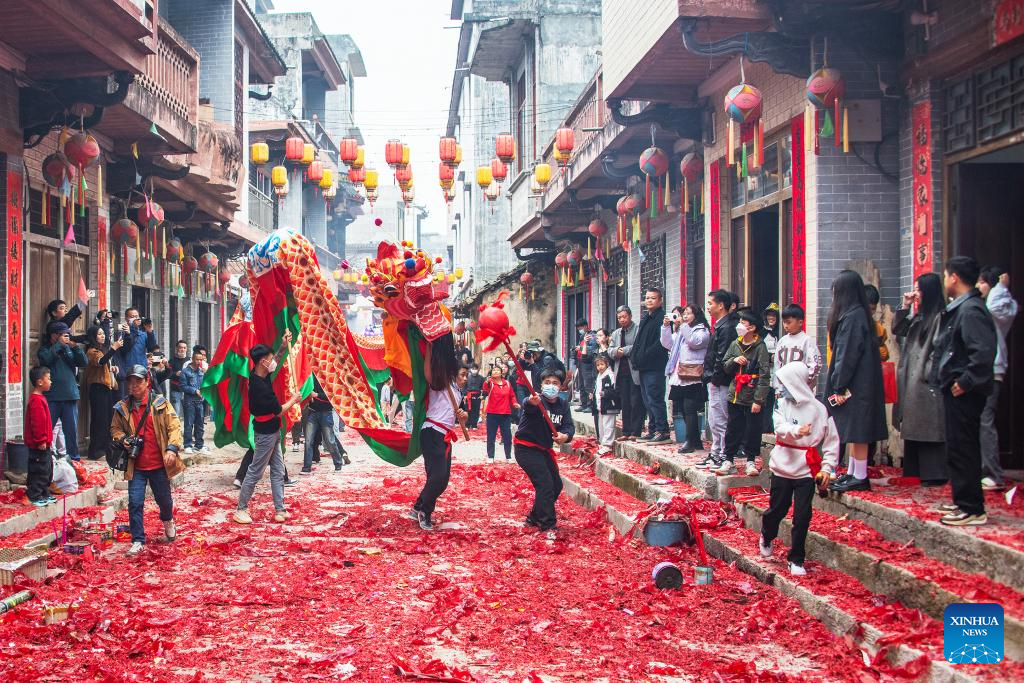 People perform dragon dance in celebration of the Spring Festival in Jingxi, south China's Guangxi Zhuang Autonomous Region, Feb. 17, 2026. This year's Spring Festival saw a surge of visitors eager to experience local cuisine, rich history and vibrant folk performances. (Photo by Zhao Jingwu/Xinhua)
