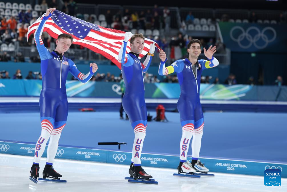 Ethan Cepuran (L), Casey Dawson (C) and Emery Lehman of the United States celebrate after the speed skating men's team pursuit final A between Italy and the United States at the Milan-Cortina 2026 Olympic Winter Games in Milan, Italy, Feb. 17, 2026. (Xinhua/Du Xiaoyi)