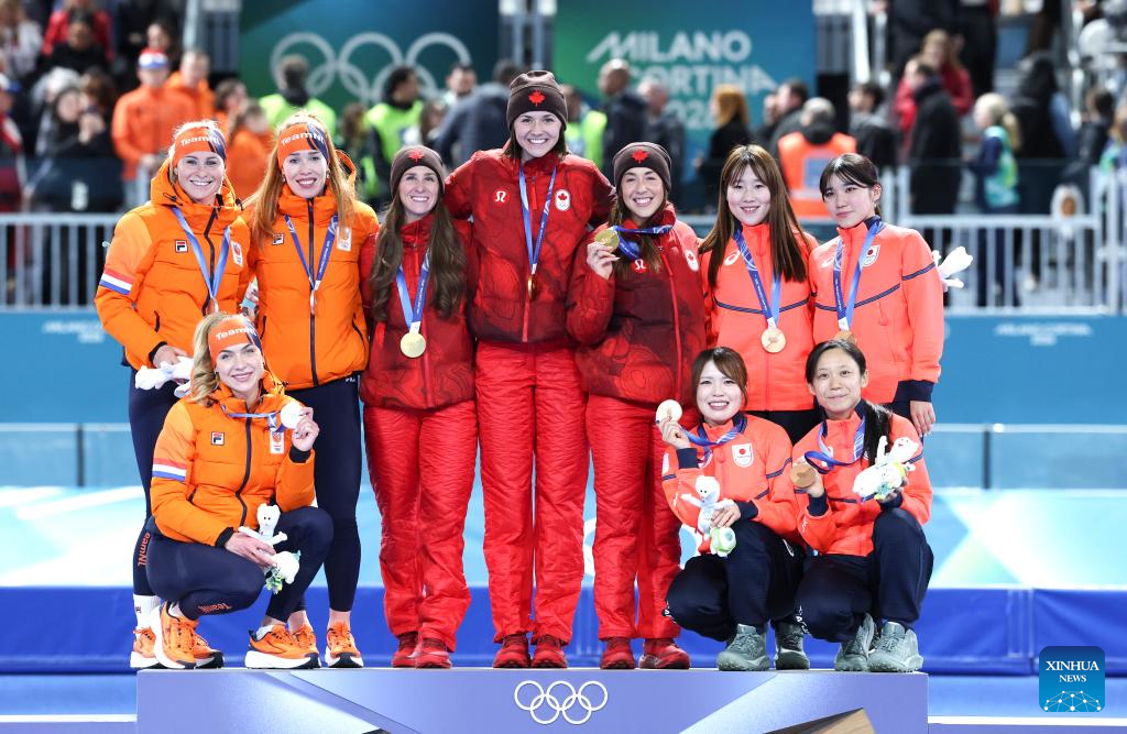 Gold medalists of Canada, silver medalists of the Netherlands and bronze medalists of Japan pose for photos during the awarding ceremony of the speed skating women's team pursuit event at the Milan-Cortina 2026 Olympic Winter Games in Milan, Italy, Feb. 17, 2026. (Xinhua/Li Jing)