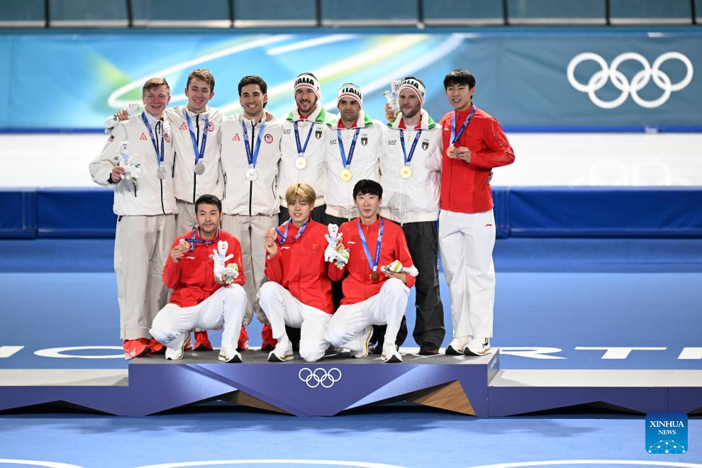 Gold medalists from Italy, silver medalists from the United States and bronze medalists from China pose for photos during the awarding ceremony of the speed skating men's team pursuit event at the Milan-Cortina 2026 Olympic Winter Games in Milan, Italy, Feb. 17, 2026. (Xinhua/Wu Wei)