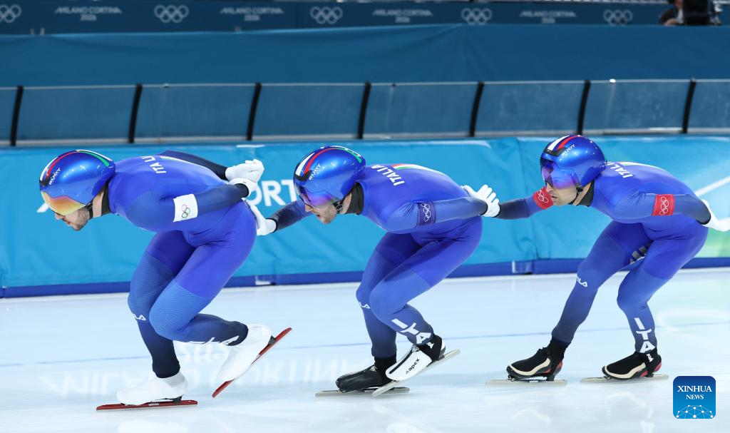 Davide Ghiotto (L), Andrea Giovannini (R) and Michele Malfatti of Italy compete during the speed skating men's team pursuit final A between Italy and the United States at the Milan-Cortina 2026 Olympic Winter Games in Milan, Italy, Feb. 17, 2026. (Xinhua/Li Jing)