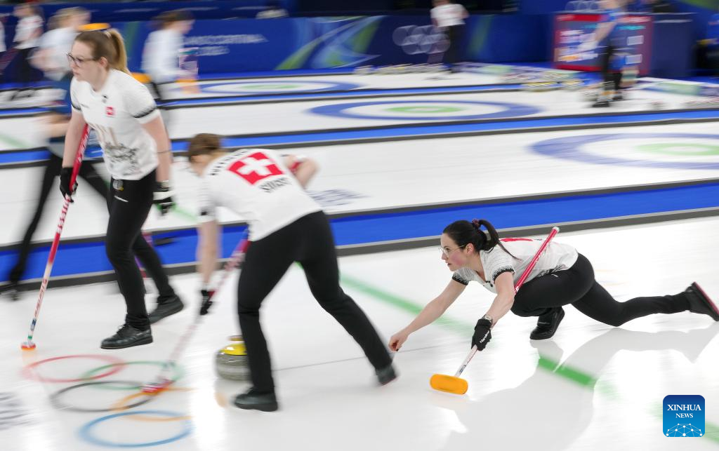 Carole Howald (R) of Switzerland competes during the curling women's round robin session 9 match between South Korea and Switzerland at the 2026 Milan-Cortina Winter Olympics in Cortina, Italy, Feb. 17, 2026. (Xinhua/Li Gang)