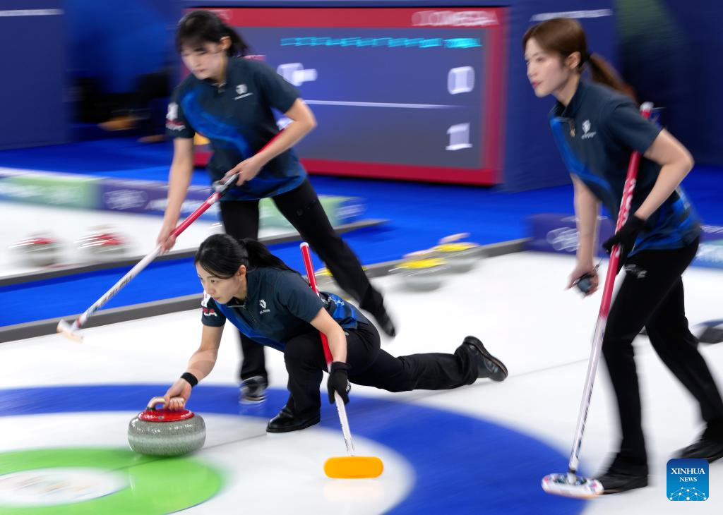 Kim Minji (C) of South Korea competes during the curling women's round robin session 9 match between South Korea and Switzerland at the 2026 Milan-Cortina Winter Olympics in Cortina, Italy, Feb. 17, 2026. (Xinhua/Li Gang)