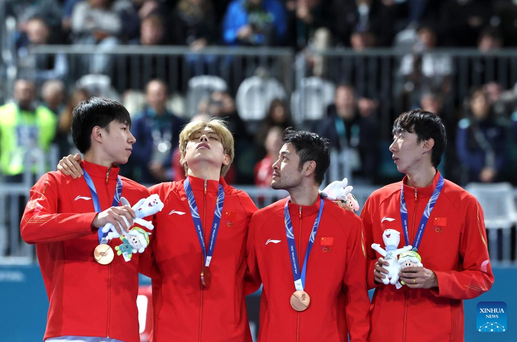 Bronze medalists Liu Hanbin, Wu Yu, Li Wenhao and Ning Zhongyan of China attend the awarding ceremony of the speed skating men's team pursuit event at the Milan-Cortina 2026 Olympic Winter Games in Milan, Italy, Feb. 17, 2026. (Xinhua/Li Jing)
