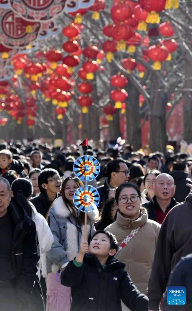 People visit a temple fair in Beijing, capital of China, Feb. 17, 2026. Temple fairs opened here celebrating the Spring Festival and presenting visitors with traditional dances, lion dances and delicious food. (Xinhua/Li Xin)