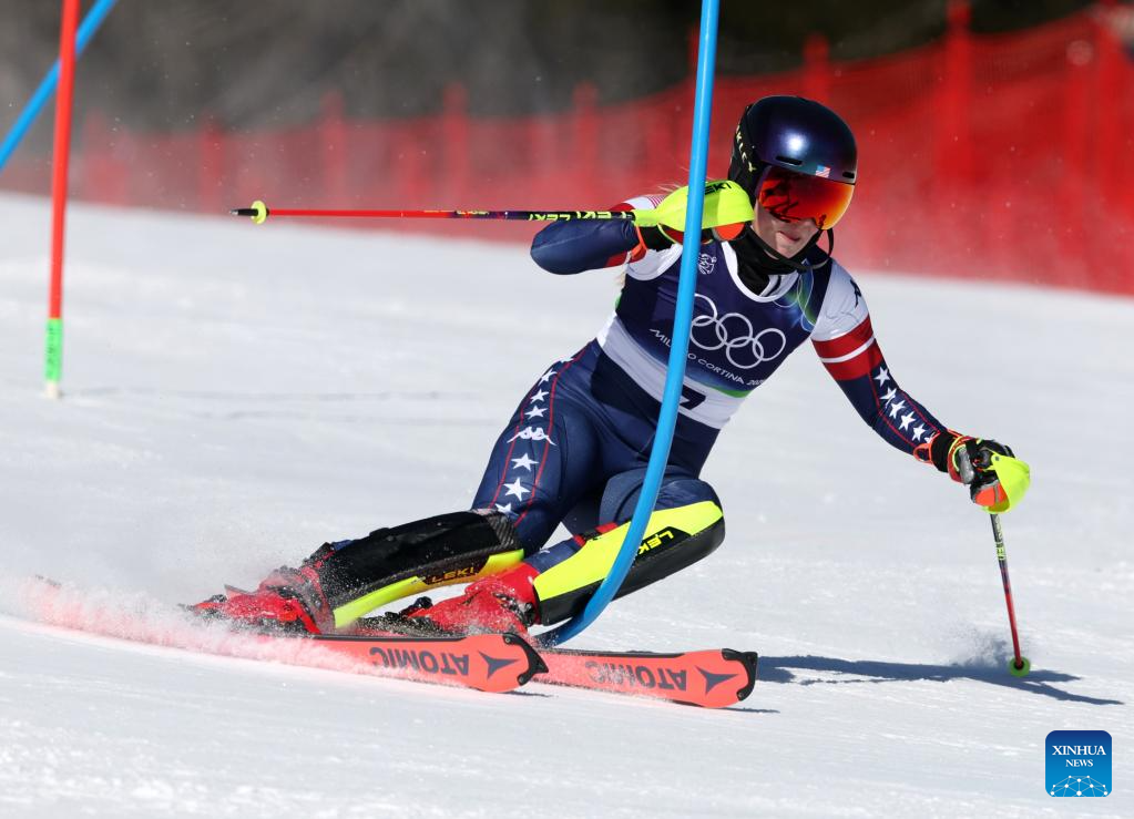 Mikaela Shiffrin of the United States competes during the alpine skiing women's slalom run 1 at the Milan-Cortina 2026 Olympic Winter Games in Cortina, Italy, Feb. 18, 2026. (Xinhua/Zhang Chenlin)