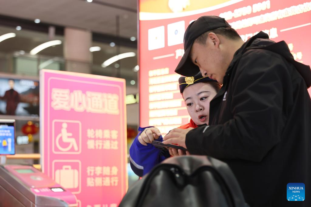 A staff member (L) helps a passenger at the metro station of Tianjin West Railway Station in north China's Tianjin, Feb. 19, 2026. During the Spring Festival travel season, civil aviation, railway, and other departments have increased transportation capacity and optimized convenient services such as air-rail intermodal transport, quiet carriages, luggage delivery, and priority channels for vulnerable groups, taking multiple measures to ensure passengers' safe and smooth travel. (Xinhua/Li Ran)