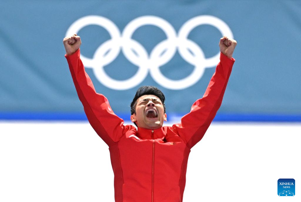 Ning Zhongyan of China celebrates during the awarding ceremony of the speed skating men's 1500m event at the Milan-Cortina 2026 Olympic Winter Games in Milan, Italy, Feb. 19, 2026. (Xinhua/Wu Wei)