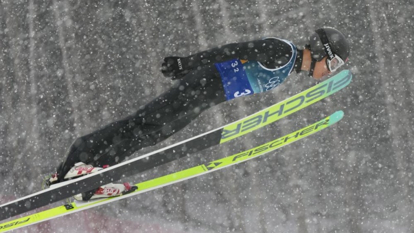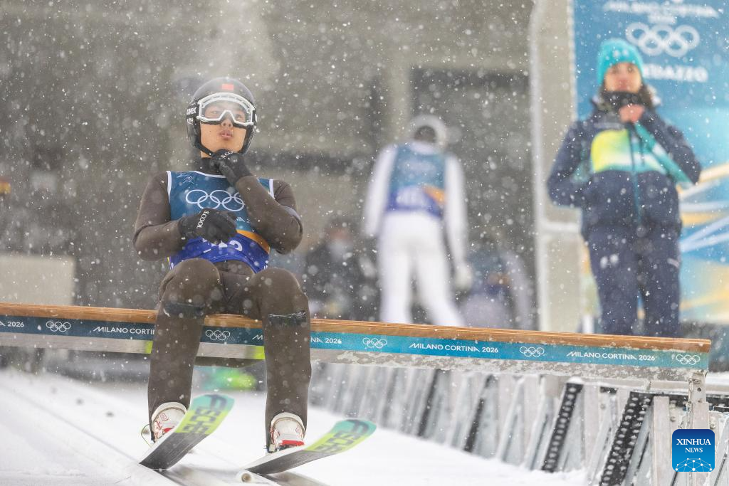 Zhao Jiawen of China is seen during the ski jumping trial round of the nordic combined team sprint at the 2026 Milan-Cortina Winter Olympics in Predazzo, Italy, Feb. 19, 2026. (Xinhua/Huang Wei)