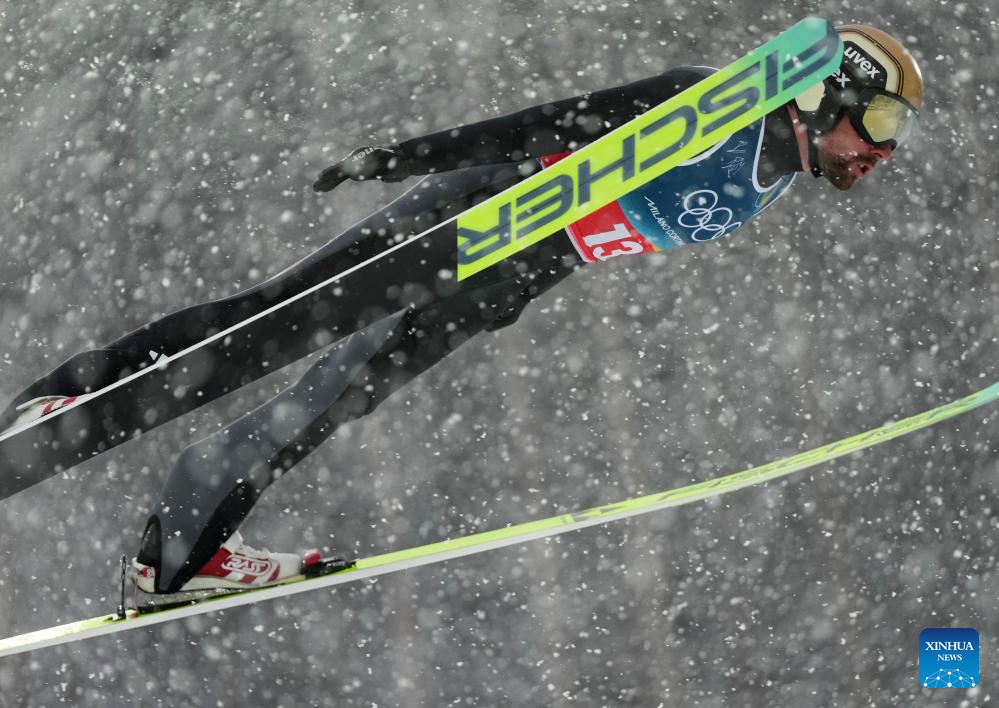 Johannes Rydzek of Germany competes during the ski jumping competition round of the nordic combined team sprint at the 2026 Milan-Cortina Winter Olympics in Predazzo, Italy, Feb. 19, 2026. (Xinhua/Meng Yongmin)