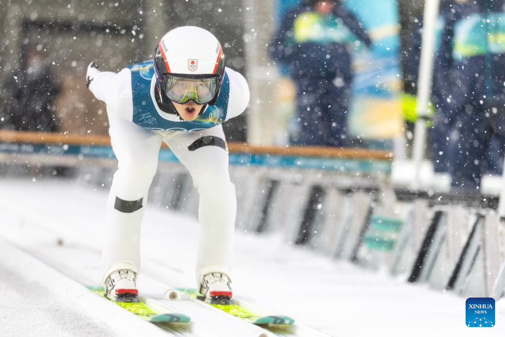 Yamamoto Ryota of Japan competes during the ski jumping trial round of the nordic combined team sprint at the 2026 Milan-Cortina Winter Olympics in Predazzo, Italy, Feb. 19, 2026. (Xinhua/Huang Wei)