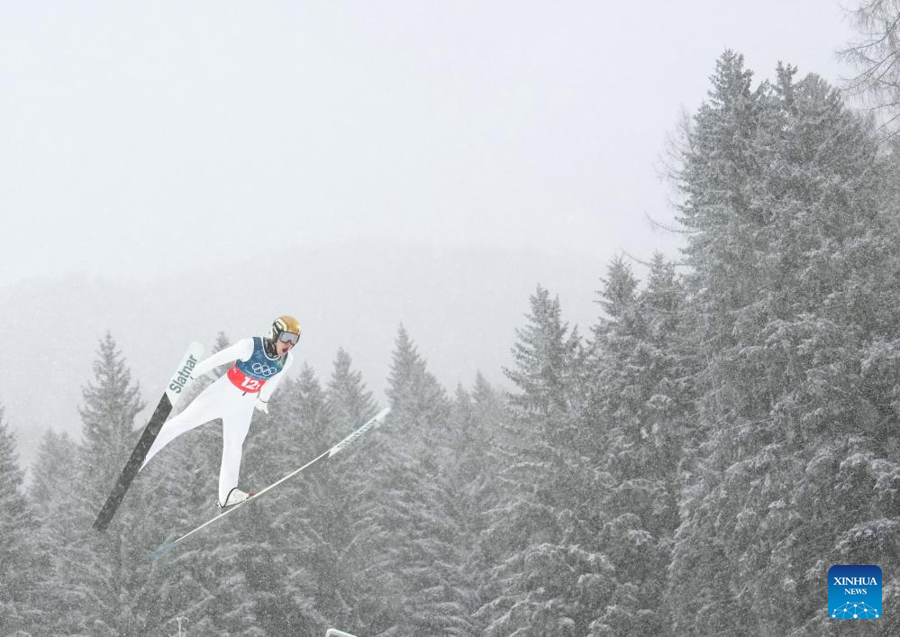 Andreas Skoglund of Norway competes during the ski jumping trial round of the nordic combined team sprint at the 2026 Milan-Cortina Winter Olympics in Predazzo, Italy, Feb. 19, 2026. (Xinhua/Meng Yongmin)
