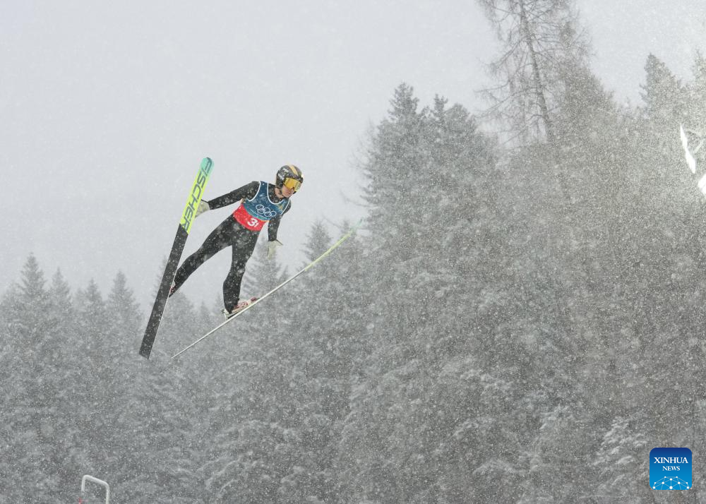 Zhao Zihe of China competes during the ski jumping trial round of the nordic combined team sprint at the 2026 Milan-Cortina Winter Olympics in Predazzo, Italy, Feb. 19, 2026. (Xinhua/Meng Yongmin)